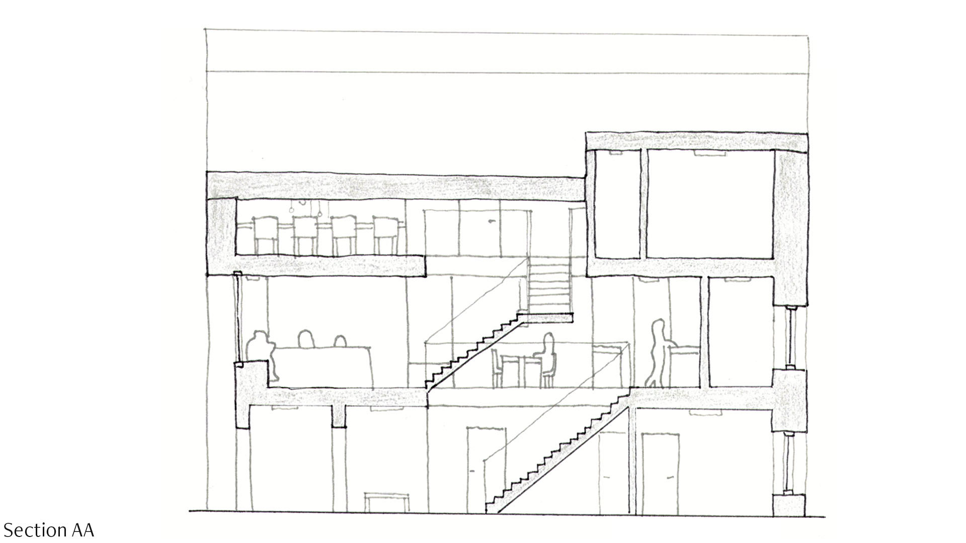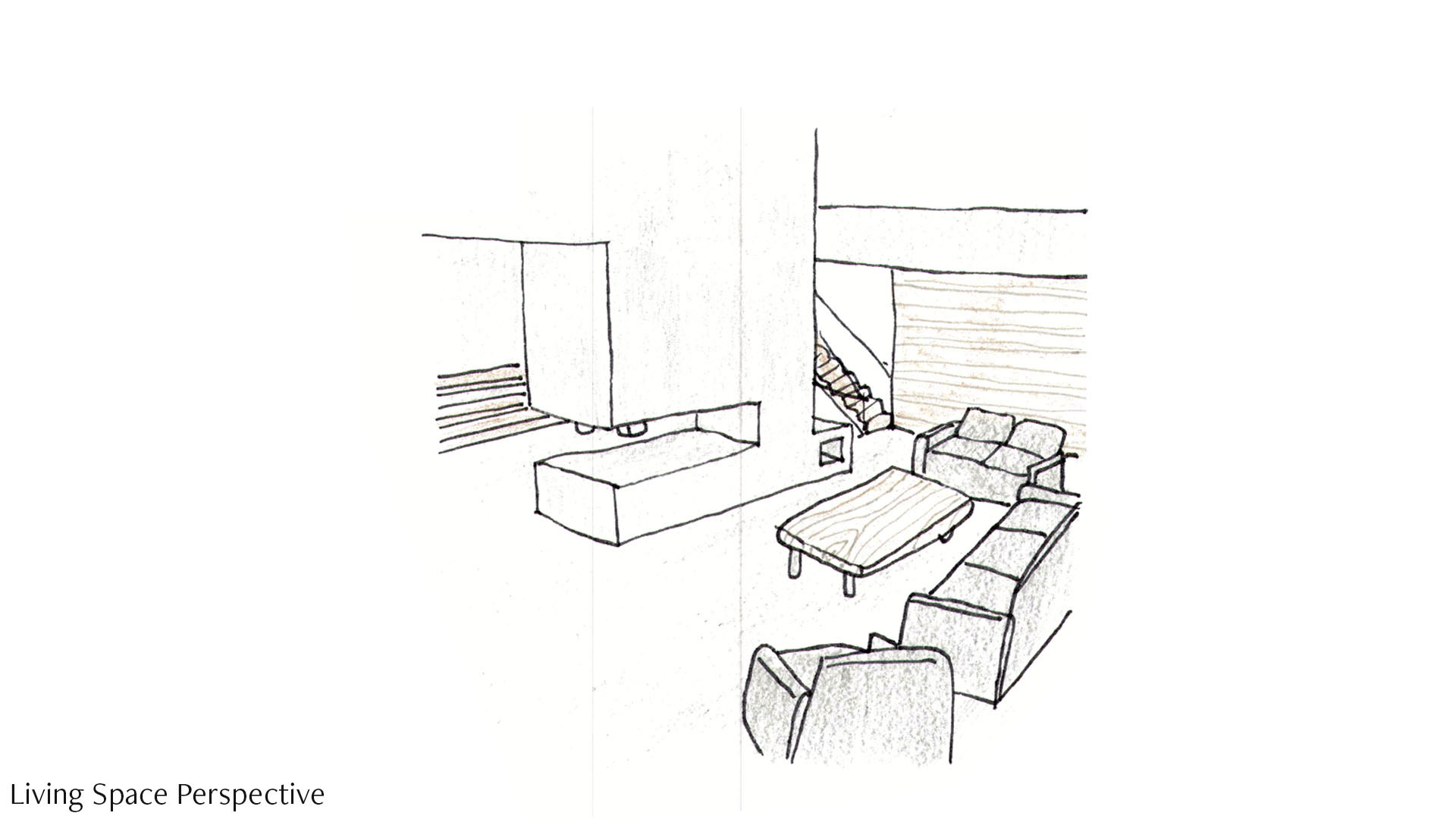 The hearth is a solid fixed element in the design, so it is made from concrete to emphasise this. Using the same material as the floor, concrete, makes it seem as if the hearth is formed from the floor. The seating arrangement in the living space allows the family to gather at the hearth.