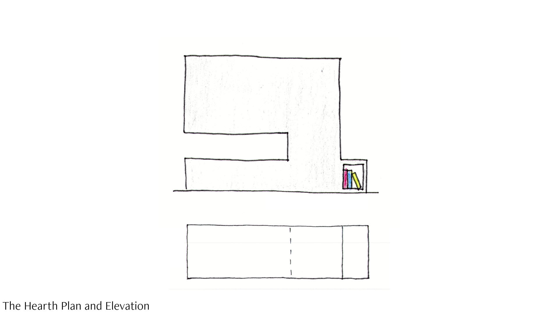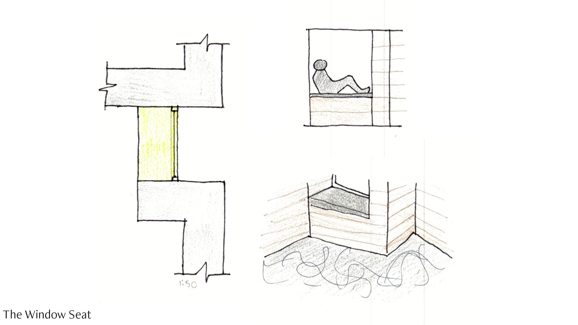 The focus for the design of the window is to create a reading nook. The window becomes its own space as it breaks up the large glazed panel on the West elevation. The shelf on the hearth connects to the window emphasising on the big idea. The user can feel protected from the elements outside as they sit to read, or people watch.