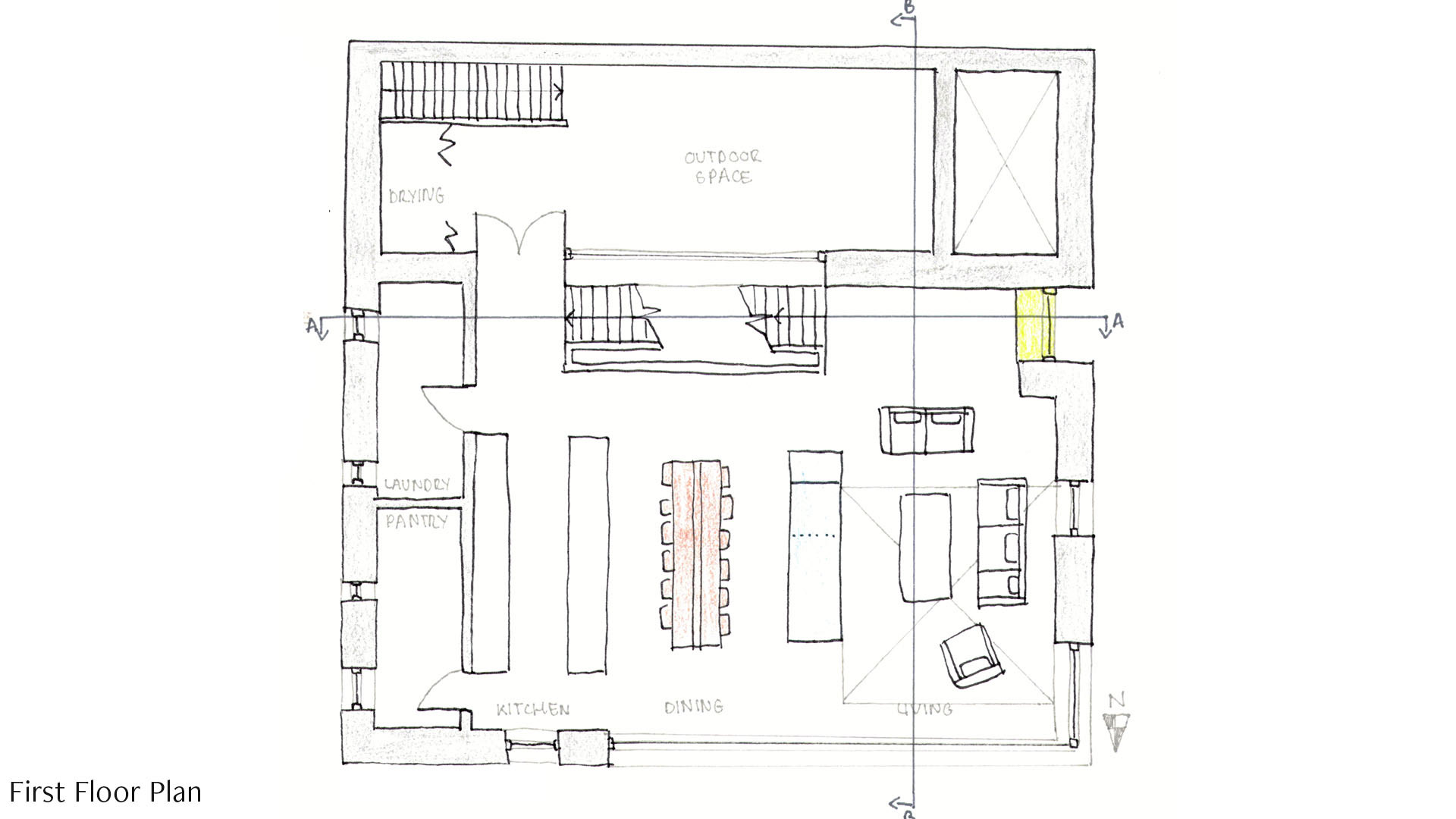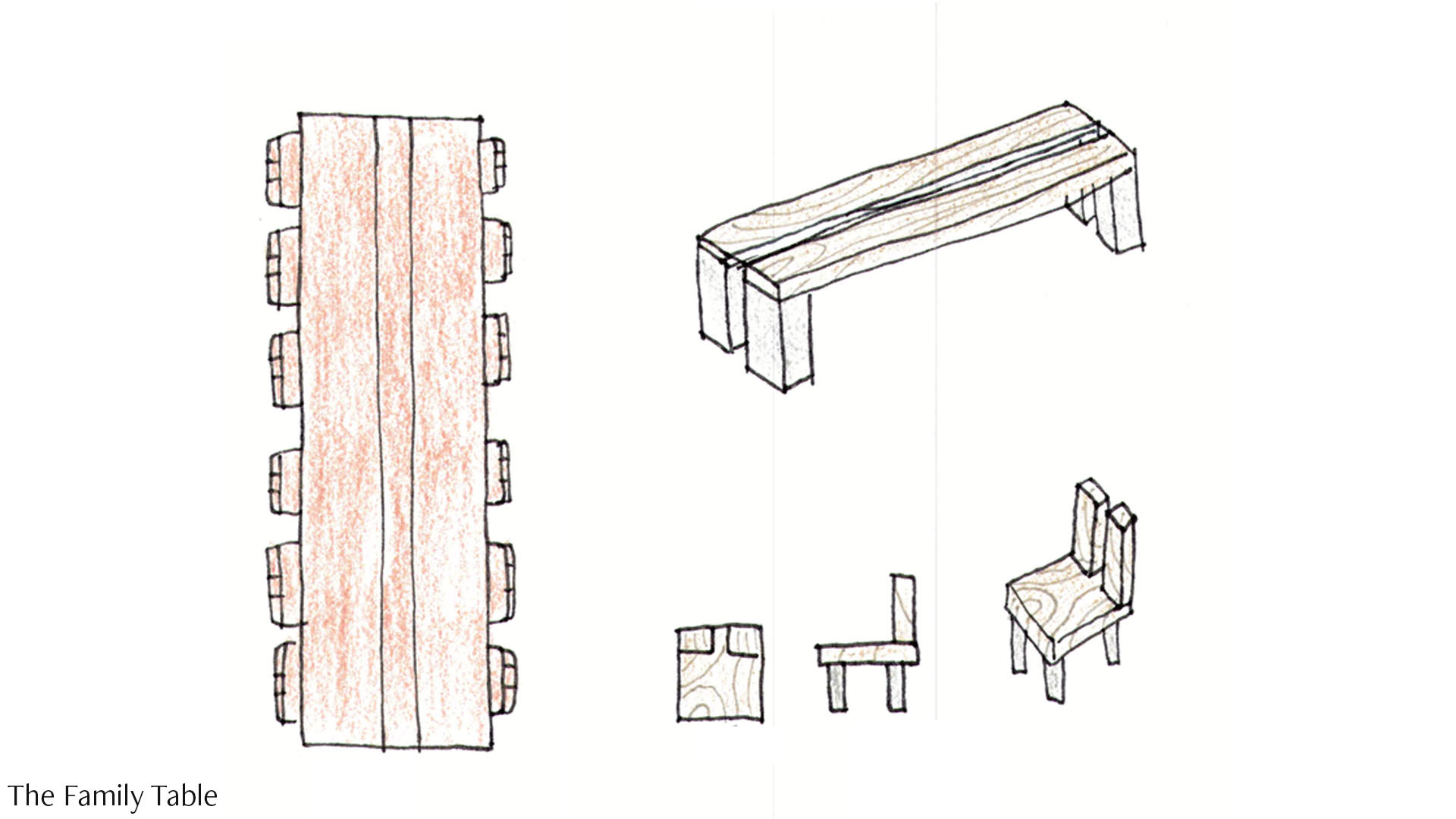 That idea of connection comes through to the kitchen table as well. Similarly, the table has concrete legs connecting it with the house, like the hearth. There is a glass panel that runs through the middle of the table symbolising the hearth opening on three sides. The family can comfortably fit around the large table and have enough room to entertain guests. The dining chair is designed to coordinate with the table.